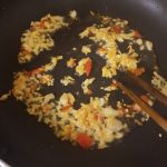 - Cho tỏi và ớt giã nhuyễn vào chảo vừa dùng để ốp trứng, phi vàng ở lửa to nhé, khoảng 15-20s, cẩn thận cháy. Đoạn này thơm ngào ngạt tỏi ớt luôn, mình hắt xì cả buổi =)) sau đó cho thịt vào, dùng thìa dằm dằm nhanh tay khỏi thịt vón cục với nhau. Đảo cho thịt săn và chín.
