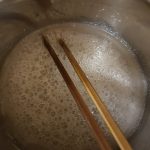 - Cho tiếp 2 thìa ăn nước nóng vào nồi. Lúc này đổ nhanh tránh bị bỏng (thực ra nó chỉ bùng xèo có tí chứ không nghiêm trọng lắm 😁)