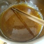 - Cho 140gr đường vào nồi cùng 2 thìa nước. Đun đường ở lửa nhỏ vừa, dùng đũa quấy đều khoảng 3-5 phút. Sau đó ngừng quấy, tăng lên lửa vừa khoảng 5-7 phút cho đường chảy. Đến khi đường có màu cánh gián thì tắt bếp lấy nồi ra