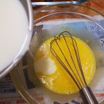 - Lòng đỏ trứng đánh tan với đường và tinh dầu vani. 500ml sữa tươi đun ấm. Sau đó đổ từ từ sữa vào trứng, không làm ngược lại nhé