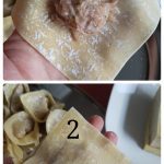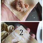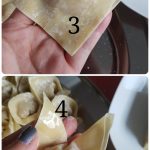 Đầu tiên cho 1 thìa cafe (gạt) nhân vào 1 góc của vỏ hoành thánh như hình 1. Sau đó gấp lên như hình 2 rồi gấp thêm 1 lần nữa như hình 3. Sau đó xoay ngược lại và thấp 1 chút nước ở 1 mép góc, tiếp đến dán 2 mép góc vào với nhau, bấm chặt. Đại khái cách 1 và 2 cũng không khác nhau lắm 🙂 -