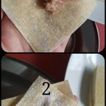 Đầu tiên lại cho 1 thìa cafe (muỗng gạt) nhân vào chính giữa. Sau đó gấp đôi lại nhưng chệch góc (hình 2). Dùng 2 tay túm lấy 2 bên rồi đẩy vào với nhau (thông cảm tự chụp nên mình chỉ cầm được 1 tay). Nhấn chặt 1 chút là ok -