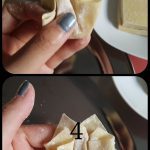 Đầu tiên cho 1 thìa cafe ( muỗng gạt) nhân vào chính giữa, sau đó thấp nước vào viền và gấp đôi lại tạo thành tam giác vuông như hình 2. Sau đó các bạn xoay ngược lại như hình 3, dùng ngón tay thấp chút nước phết lên 1 góc rồi dán 2 góc lại với nhau. Dùng tay bấm chặt để chúng dính chắc hơn. -
