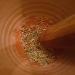 - Rễ mùi, tiêu hạt và tỏi dùng cối giã nhuyễn. Nếu các bạn không có cối thì dùng máy xay nhưng mình khuyên nên dùng cối giã thì gia vị tiết ra tinh dầu tốt hơn. Thịt thái thành từng khoanh dày khoảng 1-1,5cm.