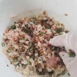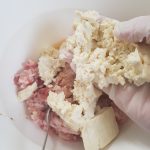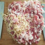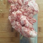 - Thịt ba chỉ thái thật nhỏ rồi dùng dao băm với 20gr gừng. Không cần quá nhuyễn và không nên dùng máy xay khiến kết cấu thịt bớt ngon (khó miêu tả quá nhưng tóm lại băm ngon hơn) . Tuy nhiên để tiện hơn các bạn có thể mua thịt lợn xay sẵn có ở siêu thị. Món này yêu cầu có mỡ nên cần chọn thịt ba chỉ hoặc thịt nửa nạc nửa mỡ