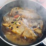 - Cho gừng, ớt cay, thân hành trắng phi thơm khoảng 30 giây, tiếp đến cho tàu xì vào phi khoảng 30 giây. Sau đó cho nước cùng muối, đường, dầu hào, xì dầu vào và đun sôi. Tiếp đến thả cá vào, dùng muôi múc nước sốt rưới lên mặt cá liên tục. Sau đó thì đậy vung và đun ở lửa nhỏ khoảng 20-30 phút, lâu lâu lật cá.