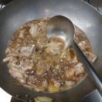- Đun nóng dầu ăn, cho gừng và phần thân hành vào phi thơm, sau đó cho sườn vào đảo ở lửa to tầm 1 phút. Tiếp đến cho nước xâm xấp mặt sườn, cho 3 tbsp dấm đen, xì dầu, rượu Thiệu Hưng, đường phèn và hoa hồi vào. Đun sôi rồi hớt bọt nếu có. Sau đó đậy vung và rim sườn tầm 25 phút ở lửa nhỏ cho sườn mềm.