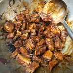 - Mở nắp vung ra, tăng lửa cho nước cạn bớt. Sau đó cho hắc xì dầu vào đảo đều. Khi nước cạn sánh thì tắt bếp, rắc vừng và 1/2 tbsp dấm đen vào rồi đảo qua một lượt nữa. Cho ra đĩa và thưởng thức, ngon nhất khi ăn sườn ở nhiệt độ phòng.