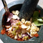 - Giã ớt cay thật nhuyễn. Sau đó cho sả, riềng, rễ mùi, lá chanh, vỏ chanh, hành khô, tỏi vào giã cùng đến khi thật mịn.