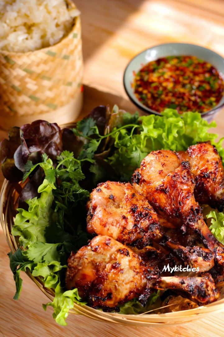 khao khua khao khua - Thịt gà cắt bỏ phần da phía dưới ở chỗ khuỷu, rồi dùng tay tuốt ngược thịt lên trên. Lúc ăn dễ cầm nắm mà lúc chiên nướng cũng đỡ bị cháy phần dưới. Nếu đùi to dày thì dùng dao khứa vài nhát để lát ướp thịt cho nhanh ngấm.