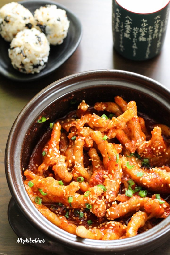 Bên Hàn mình thấy món này được làm với chân gà rút xương, loại này có bán sẵn ở siêu thị. Vì trình độ kém lẫn không rảnh nên mình dùng nguyên chân gà có xương luôn. Ăn kèm cơm nóng cũng ngon nhưng hơi nhàm chán nên mình bổ sung luôn cơm nắm trộn rong biển bắt chước i chang mấy bạn Hàn 1 tay gắp đũa chu mồm ăn chân gà 1 tay cầm nắm cơm lên cắn ngon lành. Phải công nhận là cơm trộn rong biển ngon như cơm vừng lạc, lần nào nấu cơm mình cũng vác rong biển ra trộn mù mịt, cơ mà hao cơm lắm 😛